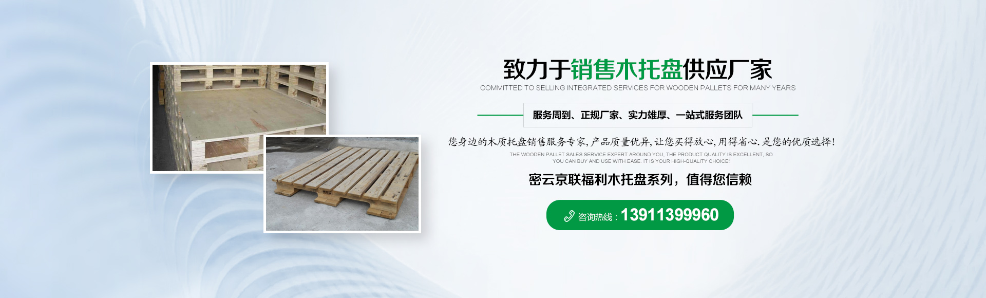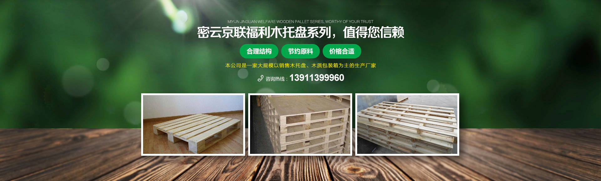 北京京聯國順木制品有限公司 (原北京市密云縣京聯福利木制品廠)成立于1993年,位于北京市密云縣西田各莊鎮蒼頭村,占地約5000平米。我公司工廠是一家大規模以銷售木托盤為主的生產廠家。本工廠是一家直接采購原木,按客戶要求生產規格尺寸的托盤,我公司工廠位于河北省承德市有著木材加工點,可以做到,從山上的木頭下山到客戶手中的托盤都是一手貨,減少了中間商的費用,所以我公司售出的產品對北京這個龐大的市場來說在同樣的規格尺寸的托盤來說價格比較占優勢。